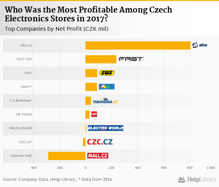 Based on a comparison of 10 firms among Czech Electronics Stores, Alza.cz generated the highest net profit in 2017 followed by FAST Czech Republic and SWS.