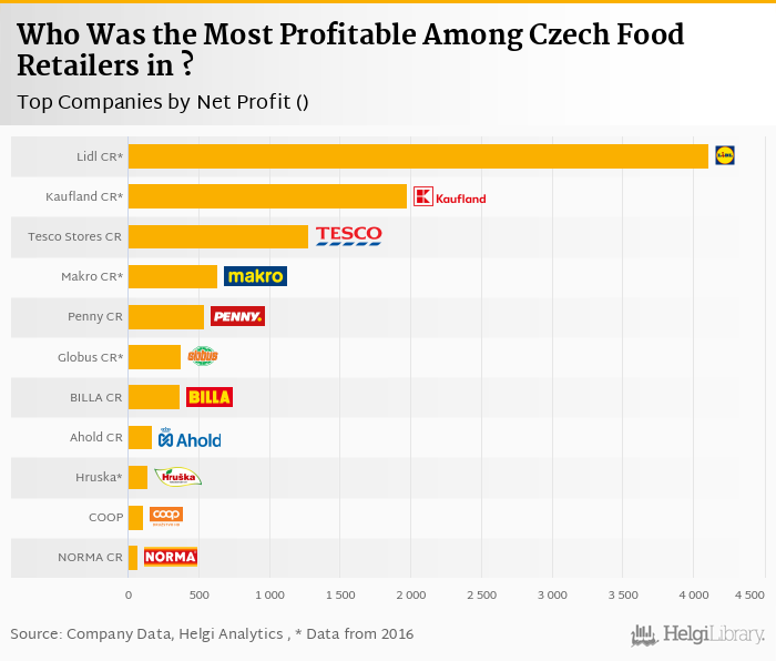 Based on a comparison of 11 firms among Czech Food Retailers, Lidl Czech Republic generated the highest net profit in 2017 followed by Kaufland Czech Republic and Tesco Stores Czech Republic.