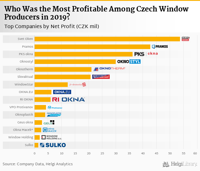 Based on a comparison of 17 firms among Czech Window Producers, Svet Oken generated the highest net profit in 2019 followed by Pramos and PKS okna.