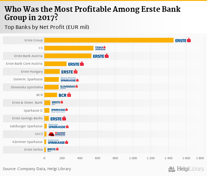 Based on a comparison of 15 banks among Erste Bank Group, Erste Group Bank produced the highest net profit in 2017, followed by Ceska Sporitelna and Erste Bank Austria.