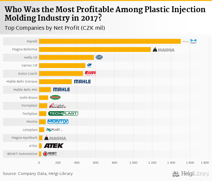 Based on a comparison of 21 firms among Plastic Injection Molding Industry, Marelli Automotive Lighting Czech Republic generated the highest net profit in 2017 followed by Magna Exteriors Bohemia and Hella Autotechnik Nova Czech Republic.