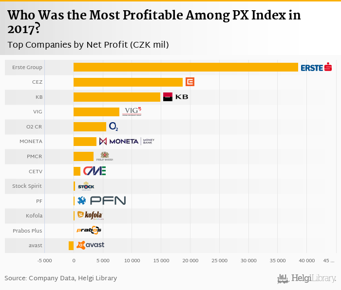 Based on a comparison of 13 firms among PX Index, Erste Group Bank generated the highest net profit in 2017 followed by CEZ and Komercni Banka.