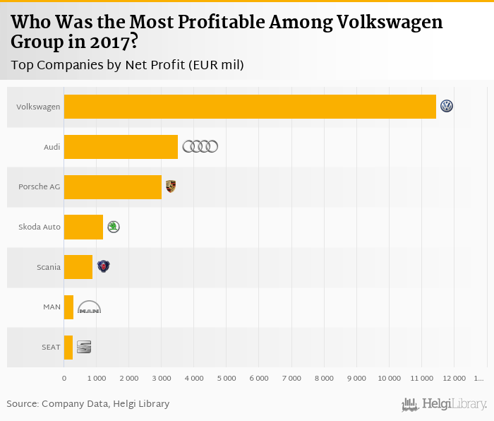 Based on a comparison of 7 firms among Volkswagen Group, Volkswagen Group generated the highest net profit in 2017 followed by Audi Group and Porsche AG.