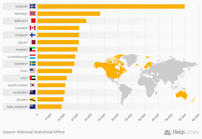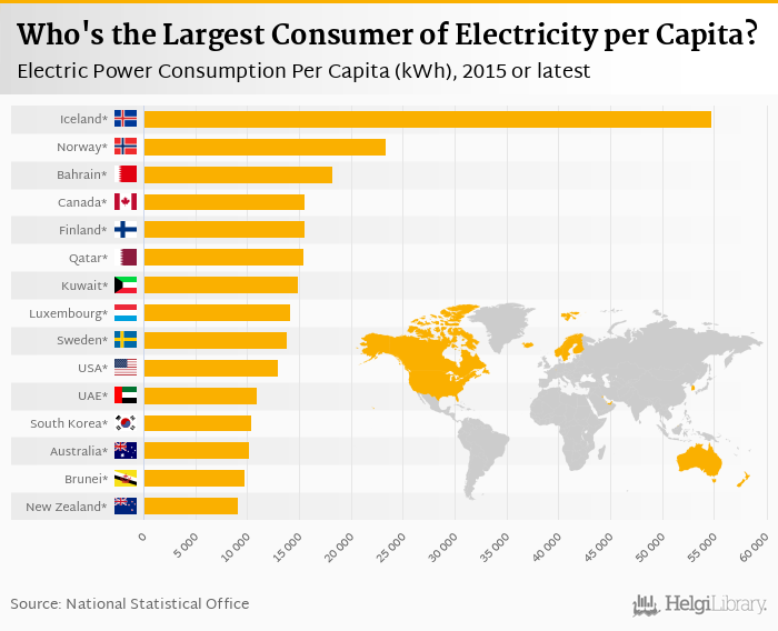 Based on a comparison of 136 countries in 2015, Iceland ranked the highest in electric power consumption per capita with 54,799 kWh followed by Norway and Bahrain. On the other end of the scale was South Sudan with 38.9 kWh, Haiti with 48.5 kWh and Niger with 48.6 kWh.