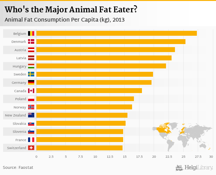 Based on a comparison of 149 countries in 2013, Belgium ranked the highest in animal fat consumption per capita with 27.3 kg followed by Denmark and Austria. On the other end of the scale was Tajikistan with 0.100 kg, Guinea with 0.200 kg and Sierra Leone with 0.200 kg.