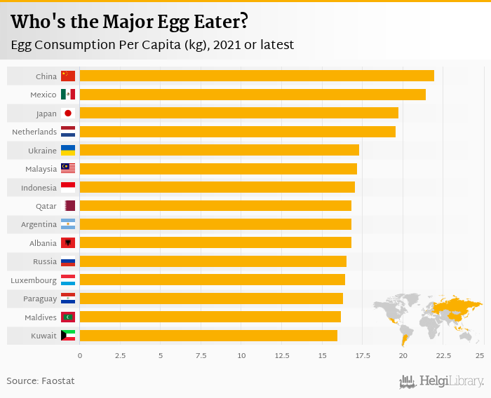 Based on a comparison of 165 countries in 2021, China ranked the highest in egg consumption per capita with 22.0 kg followed by Mexico and Japan. On the other end of the scale was South Sudan with 0.040 kg, Angola with 0.070 kg and Dem. Republic of the Congo with 0.070 kg.