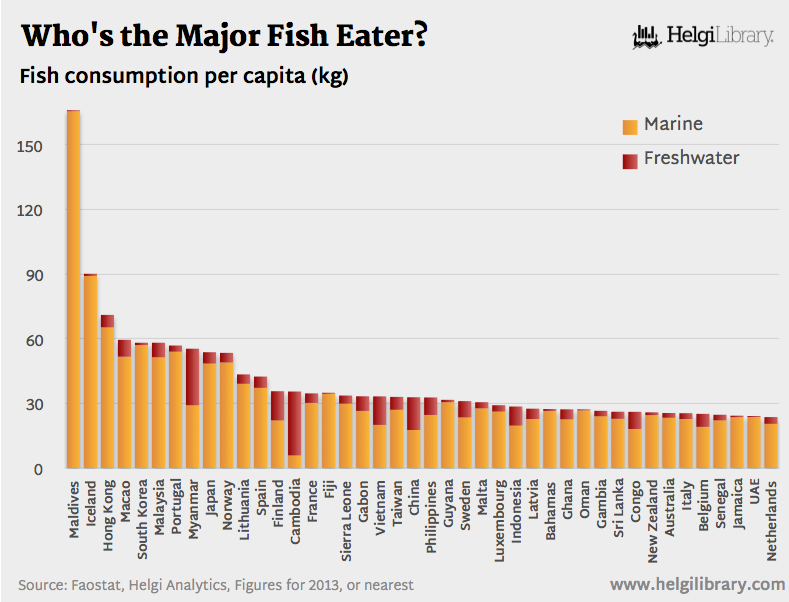 In 2013, Maldives, Iceland and Hong Kong were the biggest consumers of fish eaten by person, more than 70 kg a year. On average, we eat globally nearly 20 kg of fish per capita, according to Faostat data.