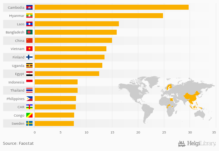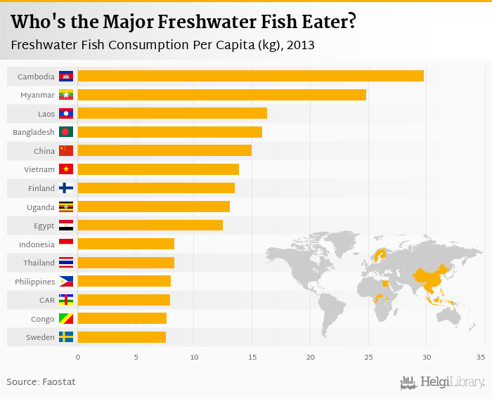 Based on a comparison of 157 countries in 2013, Cambodia ranked the highest in freshwater fish consumption per capita with 29.8 kg followed by Myanmar and Laos. On the other end of the scale was Djibouti with 0.010 kg, Yemen with 0.030 kg and East Timor with 0.050 kg.