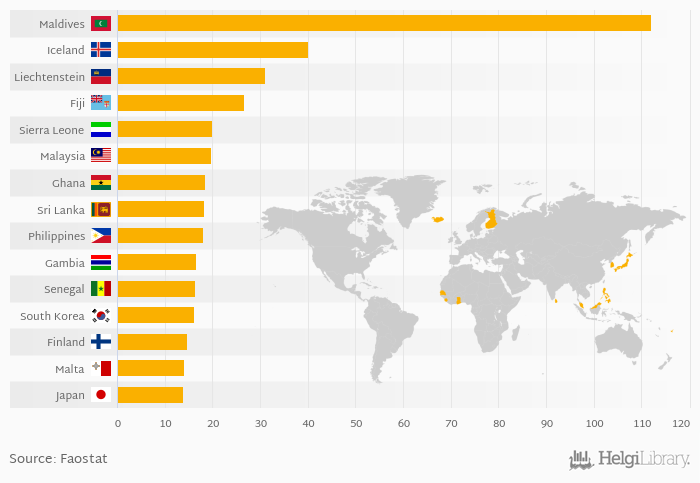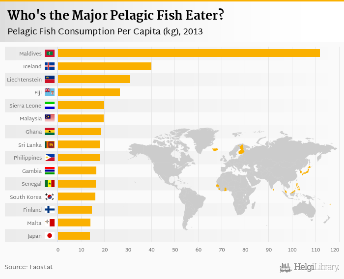 Based on a comparison of 156 countries in 2013, Maldives ranked the highest in pelagic fish consumption per capita with 112 kg followed by Iceland and Liechtenstein. On the other end of the scale was Uganda with 0.010 kg, Ethiopia with 0.010 kg and Nepal with 0.010 kg.