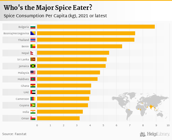 Based on a comparison of 132 countries in 2013, Bosnia and Herzegovina ranked the highest in spice consumption per capita with 6.94 kg followed by Thailand and Jamaica. On the other end of the scale was Angola with 0.010 kg, Haiti with 0.020 kg and Mozambique with 0.030 kg.