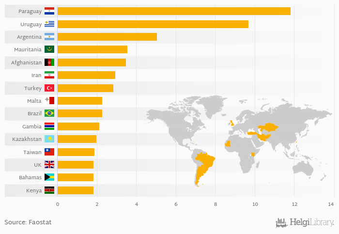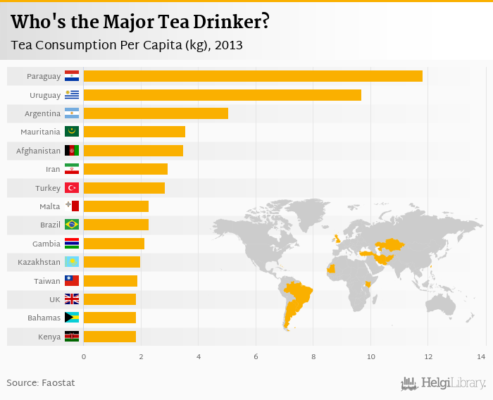 Based on a comparison of 155 countries in 2013, Paraguay ranked the highest in tea consumption per capita with 11.8 kg followed by Uruguay and Argentina. On the other end of the scale was Serbia with 0.010 kg, Uganda with 0.010 kg and Togo with 0.010 kg.