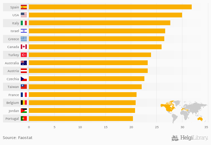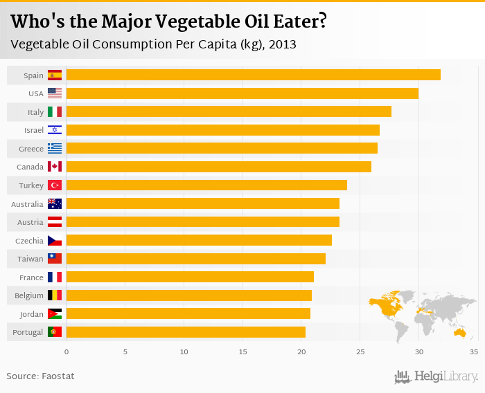 Based on a comparison of 158 countries in 2013, Spain ranked the highest in vegetable oil consumption per capita with 31.9 kg followed by USA and Italy. On the other end of the scale was Lesotho with 1.00 kg, Laos with 1.80 kg and Cambodia with 1.90 kg.