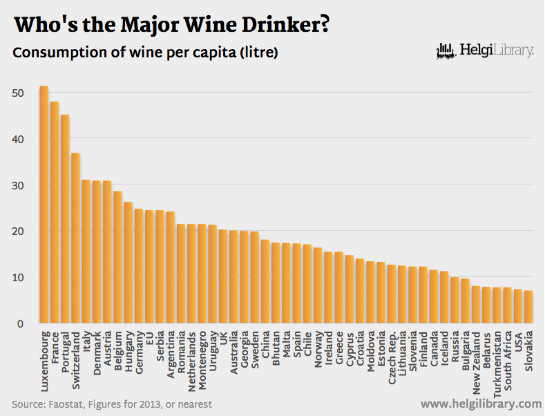 Per capita wine consumption is an even more interesting figure. Perhaps you think that the no. 1 wine-consuming country per capita by volume is France, where a meal without wine is called breakfast. Forget the stereotype. Here, Luxembourg leads the pack, ahead of France, Portugal, Switzerland and Italy., according to Faostat figures.