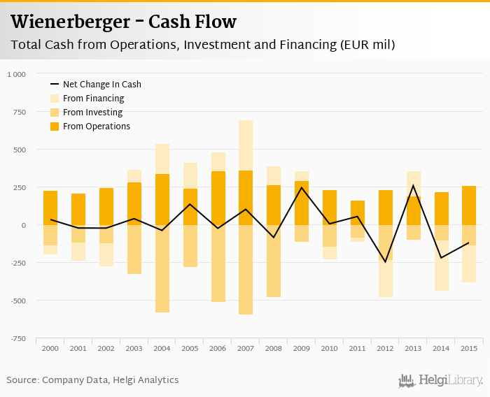 Wienerberger's operating cash flow stood at EUR 260 mil in 2015, up 20.8% when compared to the previous year. Historically, between 2000 - 2015, the firm’s operating cash flow reached a high of EUR 362 mil in 2007 and a low of EUR 164 mil in 2011.