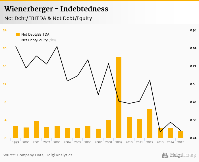 Wienerberger's net debt stood at EUR 593 mil and accounted for 0.288 of equity at the end of 2015. The ratio is down 0.056 pp compared to the previous year.