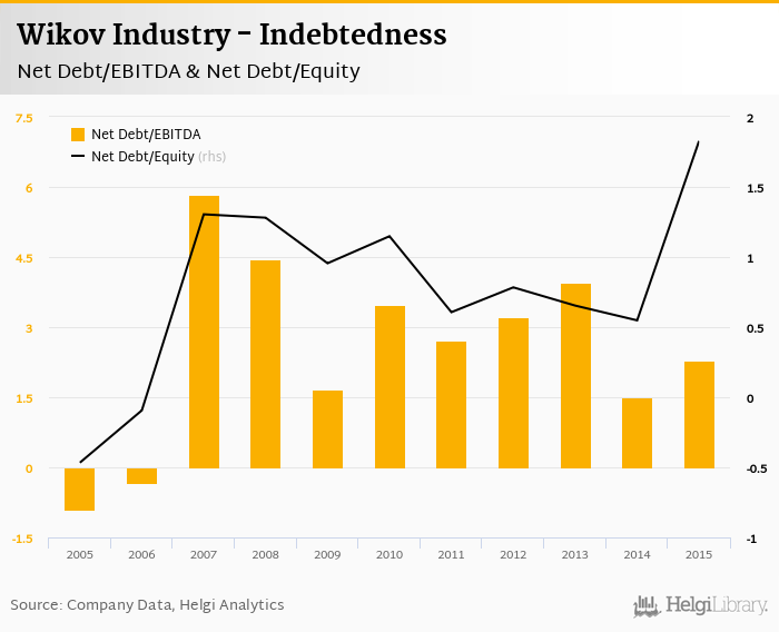 Wikov Industry's net debt stood at CZK 530 mil and accounted for 1.83 of equity at the end of 2015. The ratio is up 1.28 pp compared to the previous year.