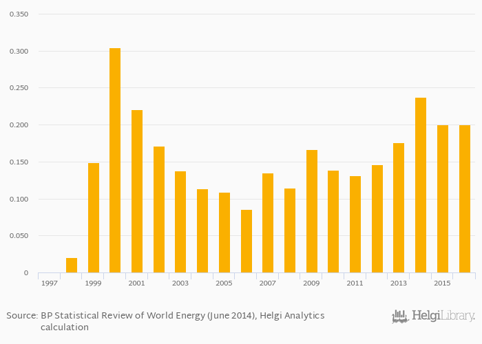 Historically, wind capacity as a share of worldwide wind turbine capacity in Morocco reached an all time high of 0.305% in 2000 and an all time low of 0% in 1997.