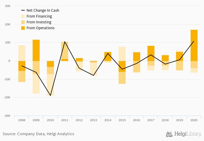 Cash from financing amounted to CZK -24.1 mil, so the company generated CZK 108 mil net cash in 2020.