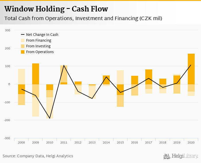 Window Holding's operating cash flow stood at CZK 171 mil in 2020, up 244% when compared to the previous year. Historically, between 2008 - 2020, the firm’s operating cash flow reached a high of CZK 171 mil in 2020 and a low of CZK -58.7 mil in 2015.