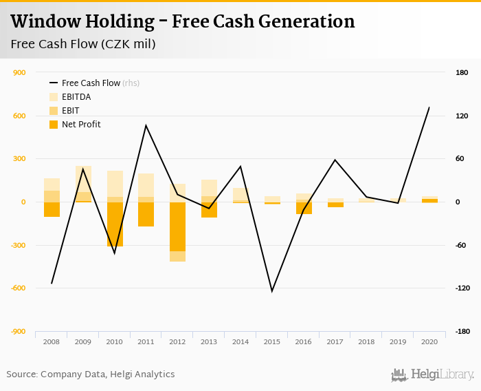The company generated cash, defined by a sum of net profit and depreciation, of CZK 45.0 mil or 2.54% of sales. When investments are excluded, free cash flow reached CZK 132 mil, or 7.43% of sales in 2020.