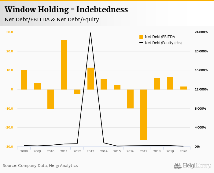 Window Holding's net debt stood at CZK 67.5 mil and accounted for 62.3% of equity at the end of 2020. The ratio is down 133 pp compared to the previous year.