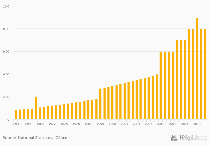 Historically, total wine consumption in Kenya reached an all time high of 9.00 Ml in 2019 and an all time low of 0.836 Ml in 1961.