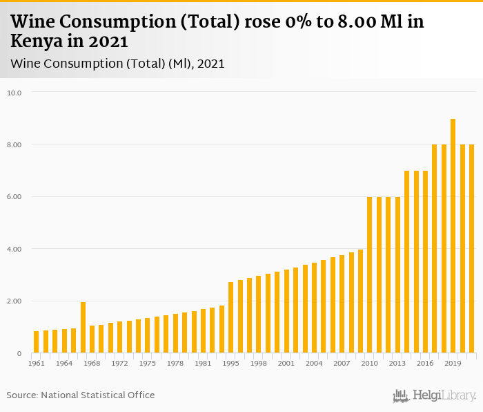 Total wine consumption rose 0% to 8.00 Ml in Kenya in 2021, according to Faostat.