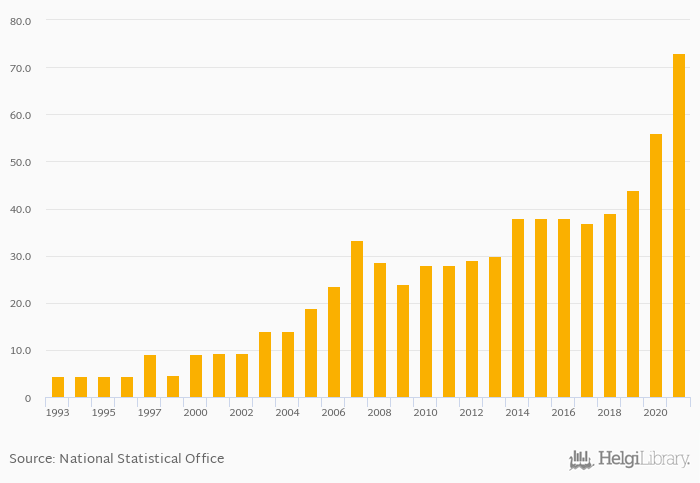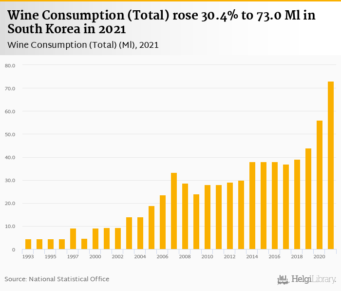 Total wine consumption rose 30.4% to 73.0 Ml in South Korea in 2021, according to Faostat.