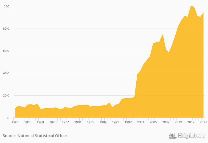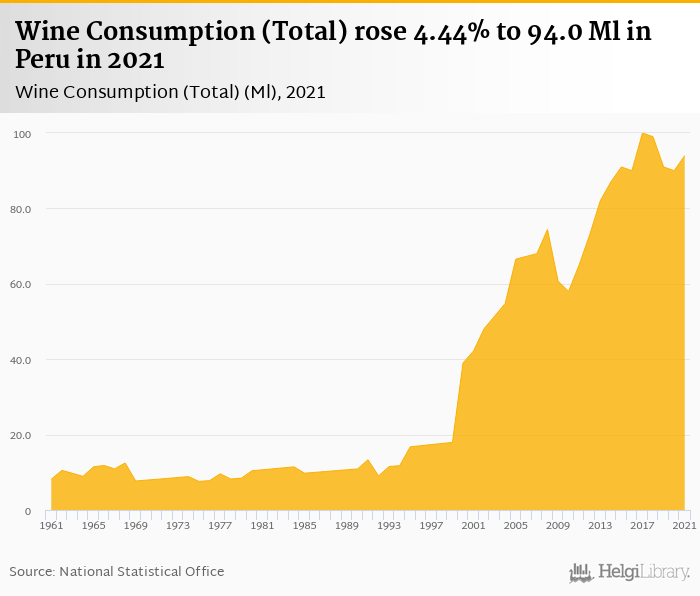 Total wine consumption rose 4.44% to 94.0 Ml in Peru in 2021, according to Faostat.