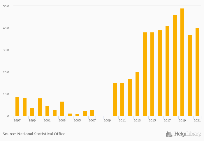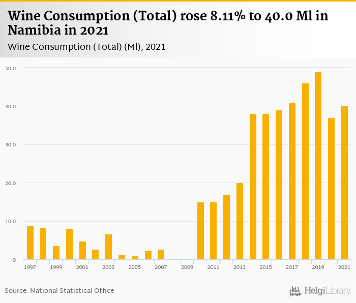 Total wine consumption rose 8.11% to 40.0 Ml in Namibia in 2021, according to Faostat.