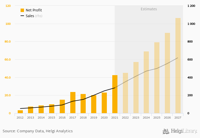 Sales have grown by 0% a year on average since 2011. They reached a high of USD 283 mil in 2021 and a low of USD 51.6 mil in 2012.
