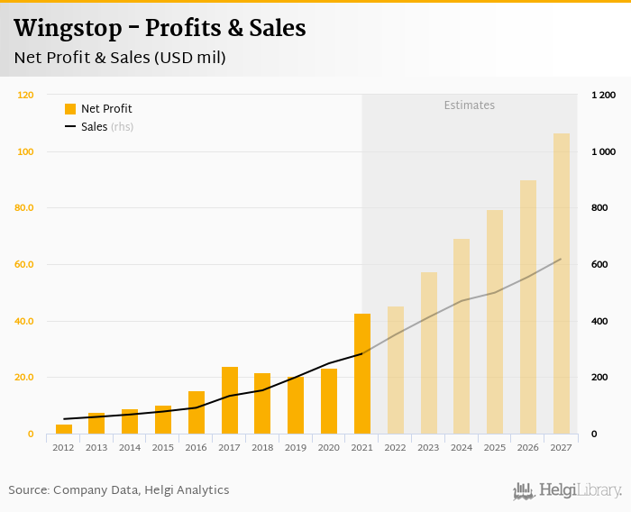 Wingstop made a net profit of USD 42.7 mil in 2021, up 83% compared to the previous year. Total sales reached USD 283 mil, which is up 13.5% when compared to the previous year.