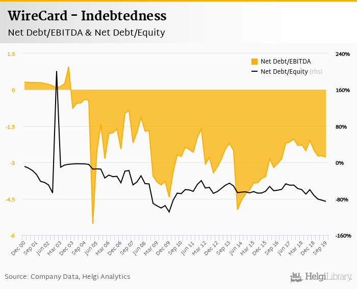 WireCard's net debt stood at EUR -1,987 mil and accounted for -85.9% of equity at the end of 3Q2019. The ratio is down 25.8 pp compared to the previous year.