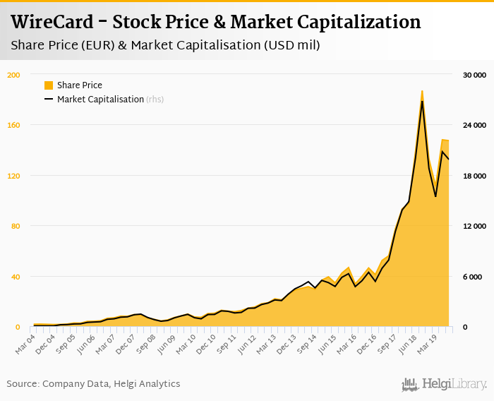 WireCard stock traded at EUR 147 per share at the end 3Q2019 implying a market capitalization of USD 19,831 mil.