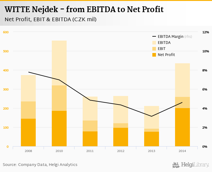 WITTE Nejdek made a net profit of CZK 201 mil with revenues of CZK 9,465 mil in 2014, up by 157% and up by 39.3%, respectively, compared to the previous year. This translates into a net margin of 2.12%.