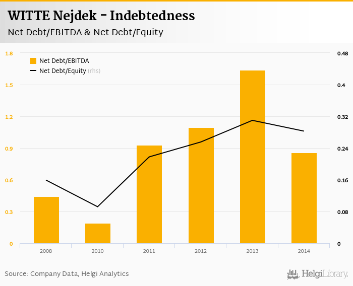 WITTE Nejdek's net debt stood at CZK 374 mil and accounted for 0.283 of equity at the end of 2014. The ratio is down 0.027 pp compared to the previous year.