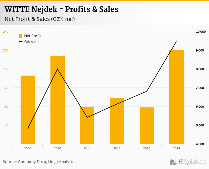 WITTE Nejdek made a net profit of CZK 201 mil in 2014, up 157% compared to the previous year. Total sales reached CZK 9,465 mil, which is up 39.3% when compared to the previous year.