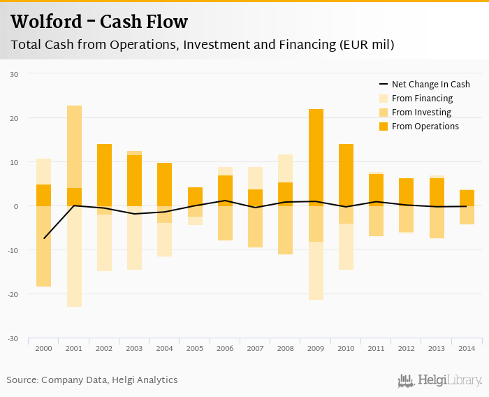 Wolford's operating cash flow stood at EUR 3.61 mil in 2014, down 42.8% when compared to the previous year. Historically, between 2000 - 2014, the firm’s operating cash flow reached a high of EUR 22.1 mil in 2009 and a low of EUR 3.61 mil in 2014.
