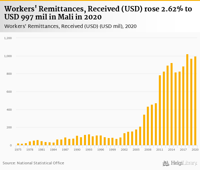Historically, workers' remittances received in Mali reached an all time high of USD 1,131 mil in 2021 and an all time low of USD 17.7 mil in 1976. When compared to Mali's main peers, workers' remittances received in Algeria amounted to USD 1,868 mil, USD 584 mil in Burkina Faso, USD 168 mil in Mauritania and USD 624 mil in Niger in 2023.