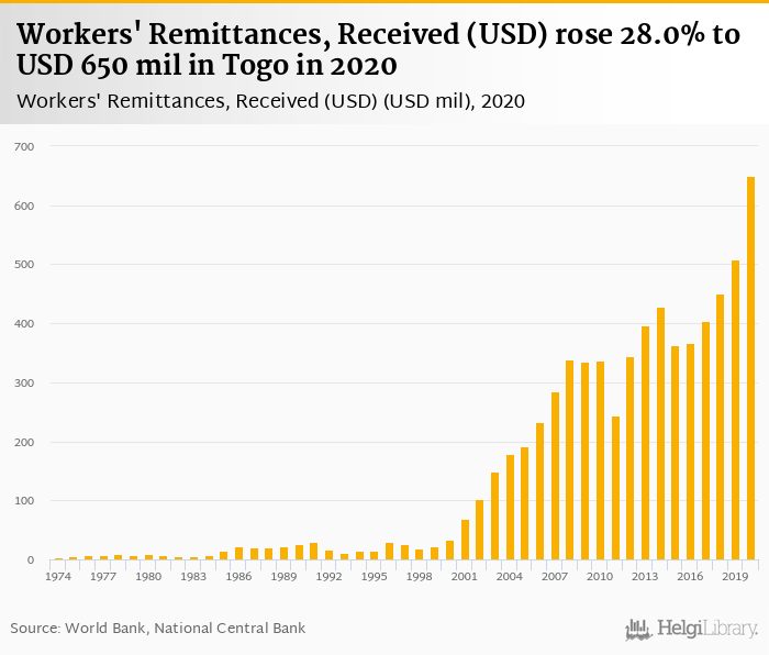 Historically, workers' remittances received in Togo reached an all time high of USD 650 mil in 2021 and an all time low of USD 4.12 mil in 1974. When compared to Togo's main peers, workers' remittances received in Benin amounted to USD 339 mil, USD 584 mil in Burkina Faso, USD 2,431 mil in Ghana and USD 19,550 mil in Nigeria in 2023.