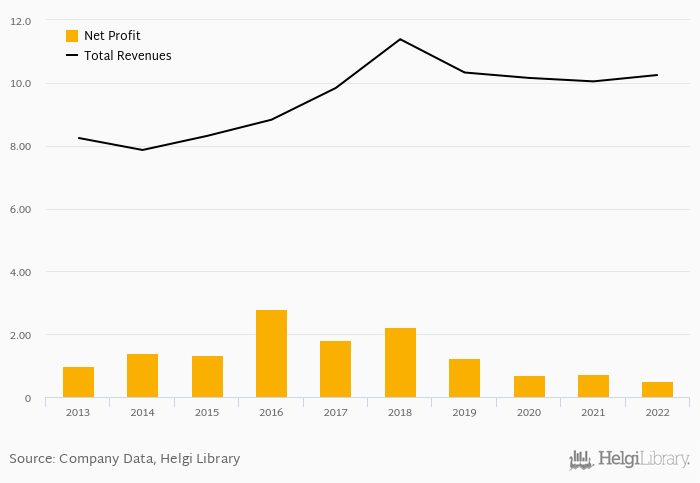 Historically, the bank’s net profit reached an all time high of EUR 2.80 mil in 2016 and an all time low of EUR 0.518 mil in 2022. The average profit in the last five years amounted to EUR 1.08 mil.