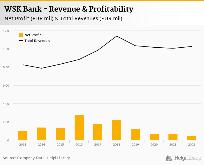 WSK Bank made a net profit of EUR 0.518 mil under revenues of EUR 10.2 mil in 2022, up -28.0% and 2.03% respectively compared to the previous year.
