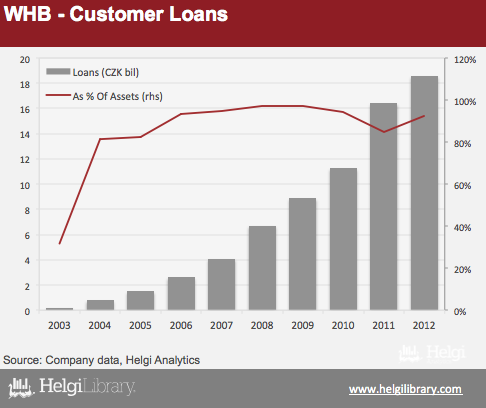 Although Wüstenrot has been growing more than twice as fast as the overall market over the last five years, its late arrival in the mortgage business a decade ago means the bank still occupies only 2.5% of the Czech mortgage lending market. Partly because of its small size and its conservative approach, the bank is relatively little profitable with ROE in single-digit territory in the last five years. Size matters and the lack of economies of scale is also reflected in Wüstenrot’s low cost efficiency. In 2012, the bank’s operating costs accounted for over 50% of bank revenues, three times as much as the other pure mortgage bank on the Czech market - Hypoteční Banka.