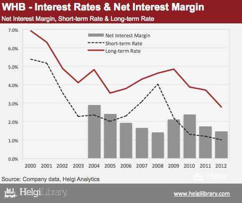Wüstenrot has been growing more than twice as fast as the overall market over the last five years to compensate for its late arrival in the mortgage business a decade ago. Together with the fall in market interest rates, no wonder bank's net interest margin dropped to 1.5% in 2012 from 2.4% seen in 2005