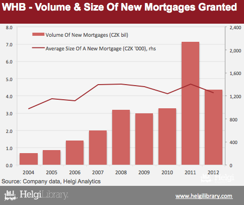 The average size of a mortgage loan reached CZK 1.26 mil in 2012, down from the peak of CZK 1.4 mil seen in 2008