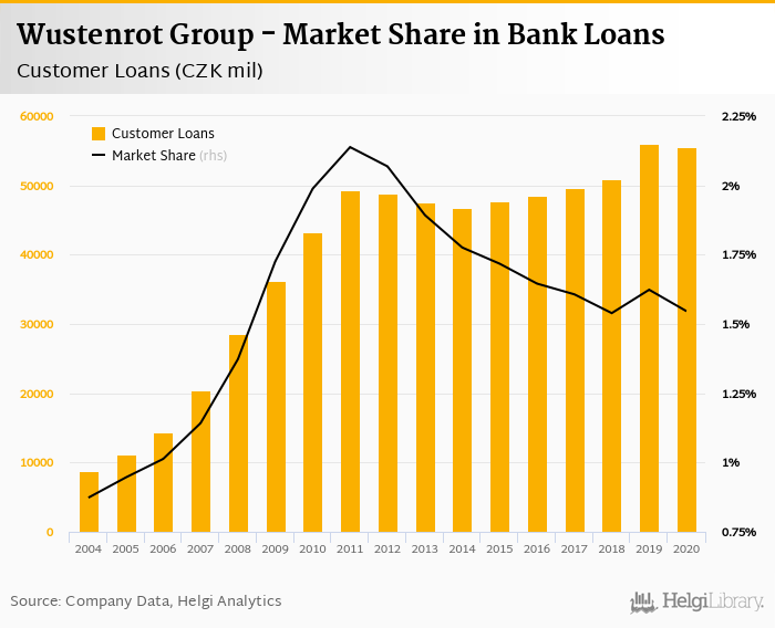 Wustenrot Group accounted for 1.55% of all customer loans issued in Czechia at the end of 2020. Historically, the bank’s market share in customer loans reached an all time high of 2.14% in 2011 and an all time low of 0.873% in 2004.