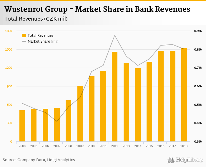 As a result, Wustenrot Group accounted for 0.801% of all bank revenues generated by banks in Czechia in 2018. Historically, the bank’s market share in total revenues reached an all time high of 0.876% in 2012 and an all time low of 0.409% in 2007.