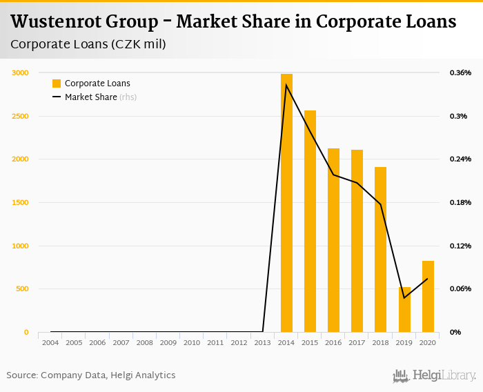 Wustenrot Group accounted for 0.074% of all corporate loans issued in Czechia at the end of 2020. Historically, the bank’s market share in corporate loans reached an all time high of 0.342% in 2014 and an all time low of 0% in 2004.