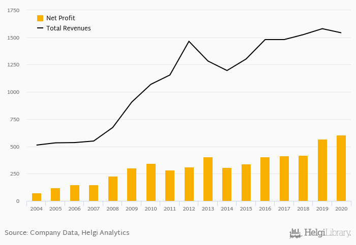 On the other hand, bank’s revenues amounted to an all time high of CZK 1,580 mil in 2019 and an all time low of CZK 512 mil in 2004. The average revenues in the last five years reached CZK 1,521 mil.