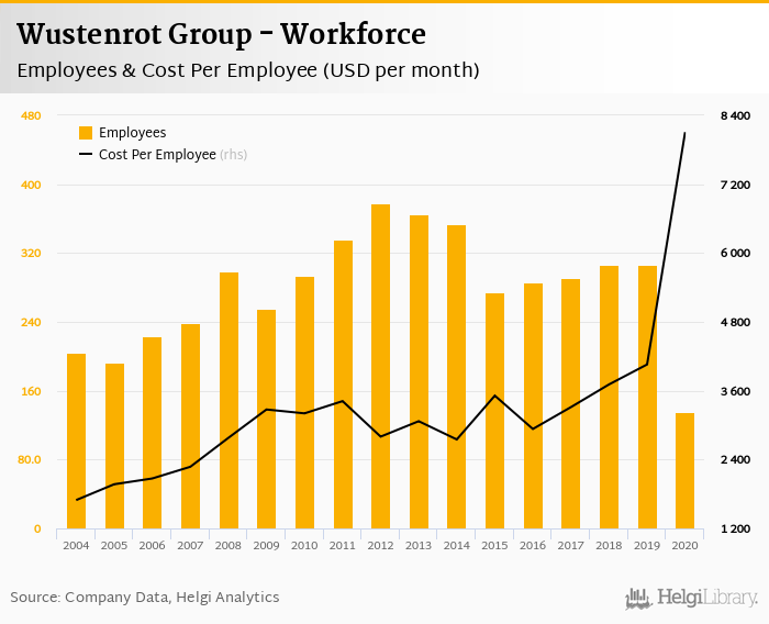 Wustenrot Group employed 135 persons in 2020, down 56.0% when compared to the previous year. Historically, the bank's workforce hit an all time high of 378 persons in 2012 and an all time low of 135 in 2020.